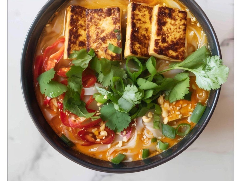 1. ČOČKOVÁ POLÉVKA S UZENÝM TOFU, VEGAN PIKATNÍ MALAJSKÁ LAKSA S RÝŽOVÝMI NUDLEMI, ROSTLINNÝ DEZERT S KALÍŠKEM VEGANSKÉ KRUPIČNÉ KAŠE SE SKOŘICÍ (SAHLEP) (1,6,11)