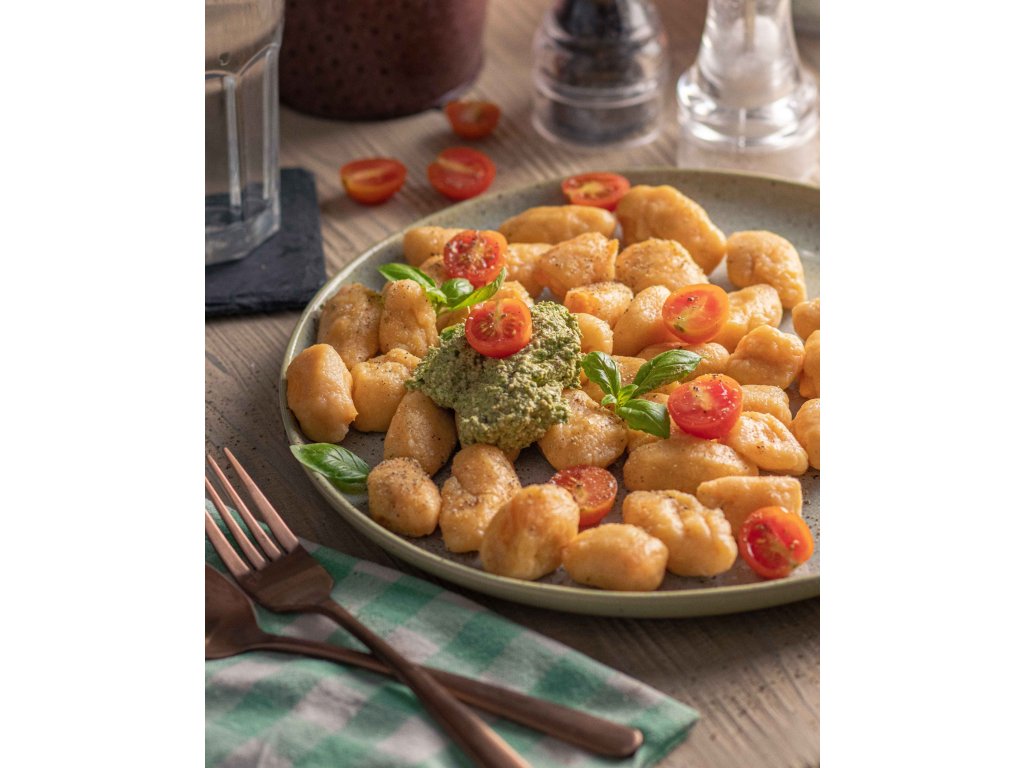 1. MINESTRONE S TĚSTOVINAMI A BAZALKOVÝM PESTEM, GNOCCHI S VEGAN RAGŮ NA ČERVENÉM VEGANSKÉM VÍNĚ, ROSTL. CHLEBÍČEK S PEČENOU HRUŠKOU A PRAVÝM ČAJEM ZELENÝ SNÍH (1,6,9)