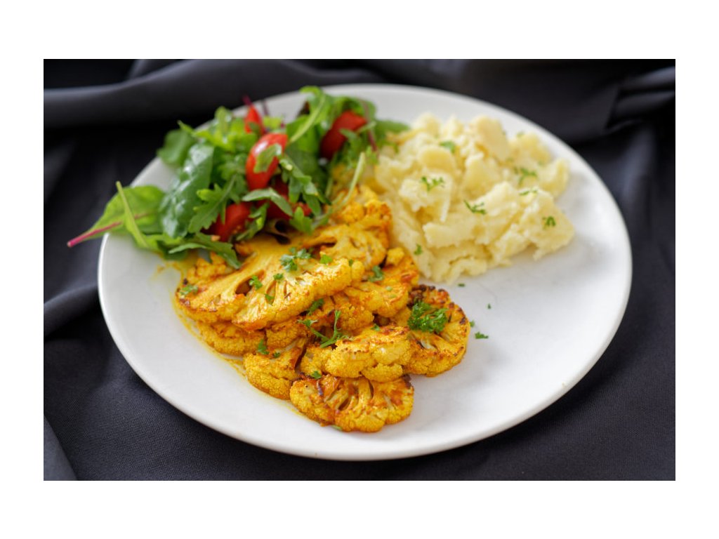1. DÝŇOVÁ POLÉVKA S KOKOSOVÝM MLÉKEM A KRUTONKY, KVĚTÁKOVÝ STEAK NA PEPŘOVÉ OMÁČCE SE ŠŤOUCHANÝMI BRAMBORAMI A GRIL. ZELENINOU, ROSTLINNÝ DEZERT A PRAVÝ JOGÍNSKÝ ČAJ BRAHMI (1)