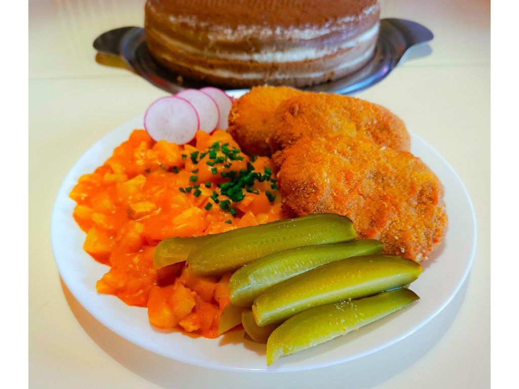 2. ZELENINOVÝ VÝVAR S NUDLEMI, ROSTLINNÝ HOLANDSKÝ ŘÍZEK S VEGAN SMETANOVÝMI BRAMBORAMI, OKURKA, VEGAN SYPANÝ JABLEČNÝ KOLÁČ (1,6,9)