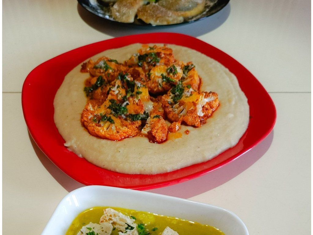 1. ZELENINOVÝ VÝVAR S NUDLEMI, KVĚTÁKOVÝ STEAK S CHIMICHURRY A S PYRÉ Z MÁSLOVÝCH FAZOLÍ, VEGAN SYPANÝ JABLEČNÝ KOLÁČ (1,6,9)