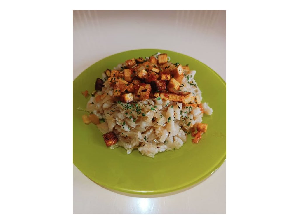 tříchodové menu 2 - ŽAMPIONOVÁ POLÉVKA SE ZELENINOU A KUSKUSEM, HALUŠKY S ROSTLINNOU BRYNDZOU A TOFU SLANINKOU, VEGAN MOUČNÍK S TŘEŠNĚMI A ČAJEM MAROCKÉ KARKADE (1,6)