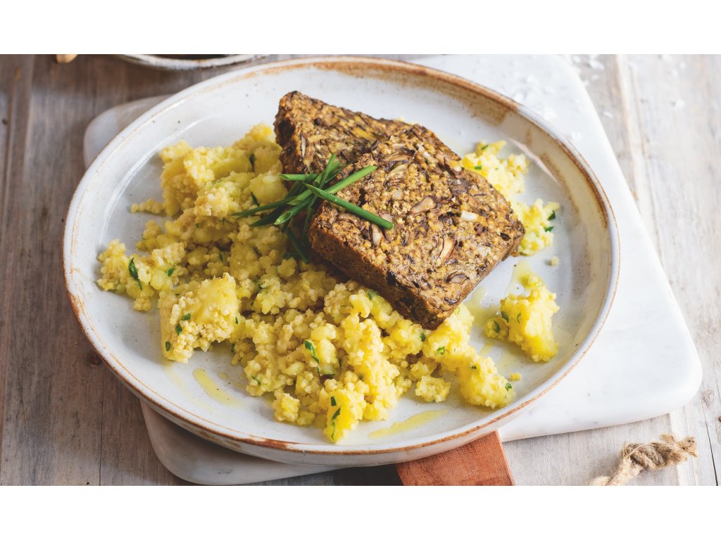 tříchodové menu 1 - ŽAMPIONOVÁ POLÉVKA SE ZELENINOU A KUSKUSEM, VEGANSKÁ PEČENĚ, VAŘENÉ BRAMBORY, GRILOVANÁ ZELENINA, VEGAN MOUČNÍK S TŘEŠNĚMI A ČAJEM MAROCKÉ KARKADE (1,6)
