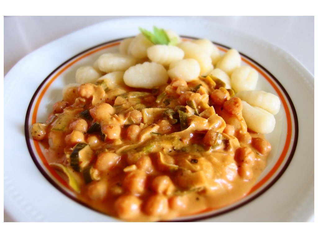 1. ČESNEČKA S ROSTL. SÝREM A PRAŽENÝM CHLEBEM, CIZRNA NA PAPRICE S PÓRKEM, VEGANSKÉ MÁSLOVÉ NOKY, VEGAN TIRAMISU S KALÍŠKEM INDICKÉHO BRAHMI (1,9,11)