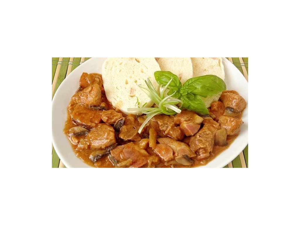 1. KRÉM Z PEČENÉHO LILKU, VEGANSKÝ ZÁHORÁCKÝ GULÁŠ S VEGAN HOUSKOVÝM KNEDLÍKEM, ROSTLINNÝ MRKVOVÝ DORT S BANÁNOVÝM KRÉMEM A KALÍŠKEM EGYPTSKÉHO KARKÁDE (1,6)
